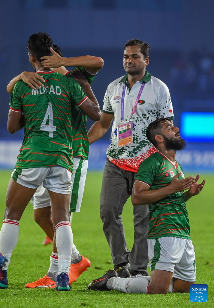 (230925) -- HANGZHOU, Sept. 25, 2023 (Xinhua) -- Players of Bangladesh react after the men's football group A round match between China and Bangladesh at the 19th Asian Games in Hangzhou, east China's Zhejiang Province, Sept. 24, 2023. (Xinhua/Yan Linyun)