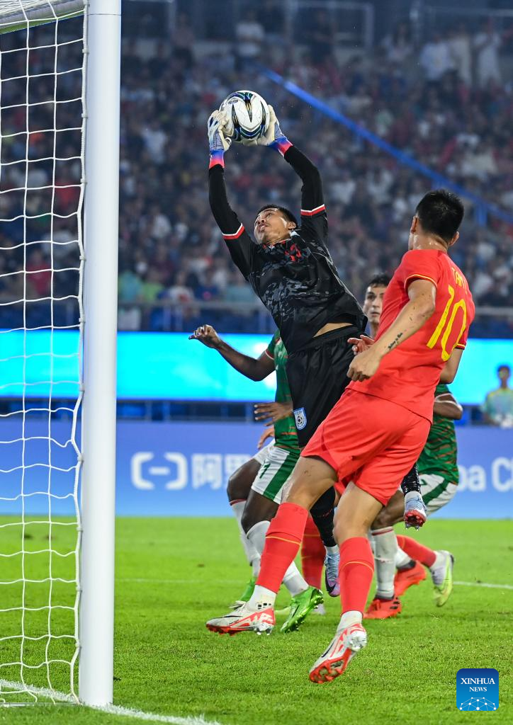 Marma Mitul (1st, L) , goalkeeper of Bangladesh, competes during the Men's First Round Group A match of Football between China and Bangladesh at the 19th Asian Games in Hangzhou, east China's Zhejiang Province, Sept. 24, 2023. (Xinhua/Yan Linyun)