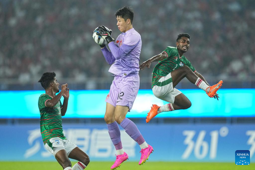 Huang Zihao (C), goalkeeper of China, competes during the Men's First Round Group A match of Football between China and Bangladesh at the 19th Asian Games in Hangzhou, east China's Zhejiang Province, Sept. 24, 2023. (Xinhua/Wu Zhuang)