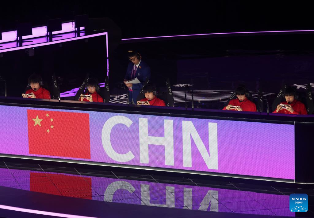 Players of team China prepare before the Arena of Valor Asian Games Version Quarterfinal match of Esports at the 19th Asian Games in Hangzhou, east China's Zhejiang Province, Sept. 24, 2023. (Xinhua/Hu Xingyu)