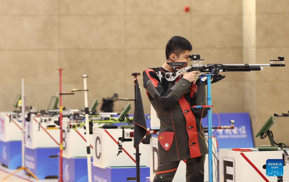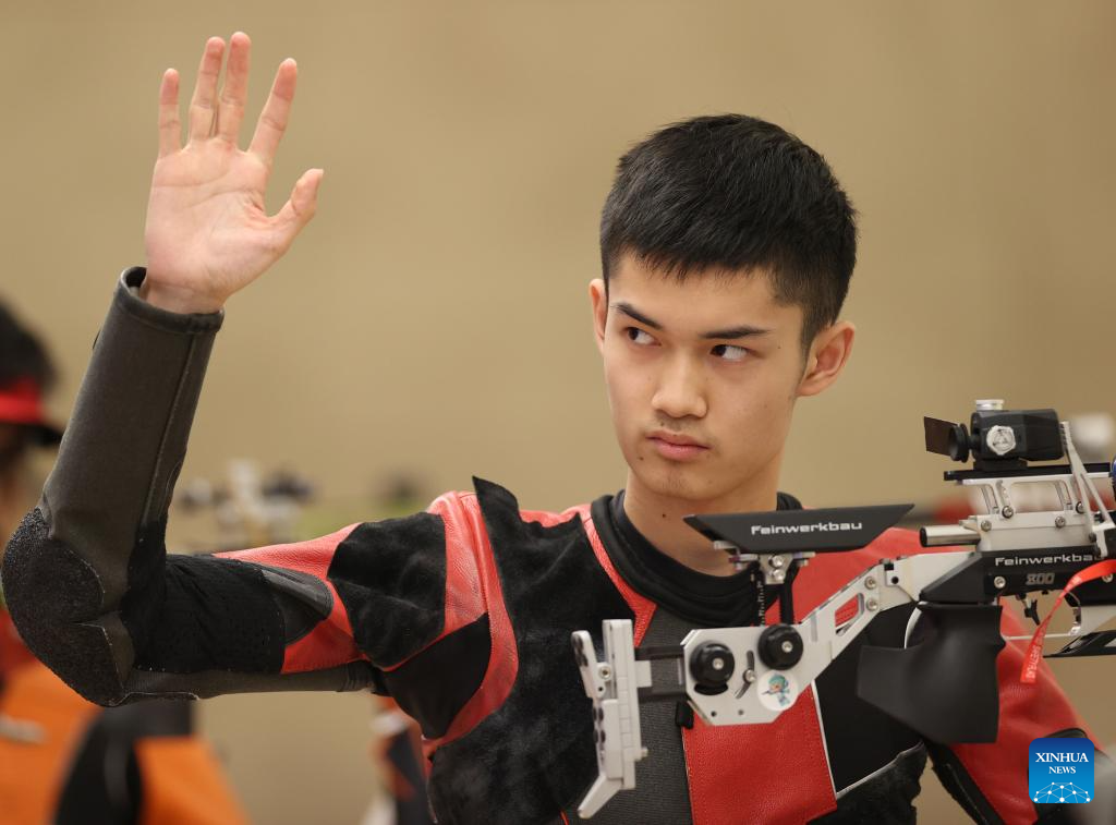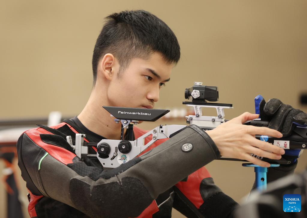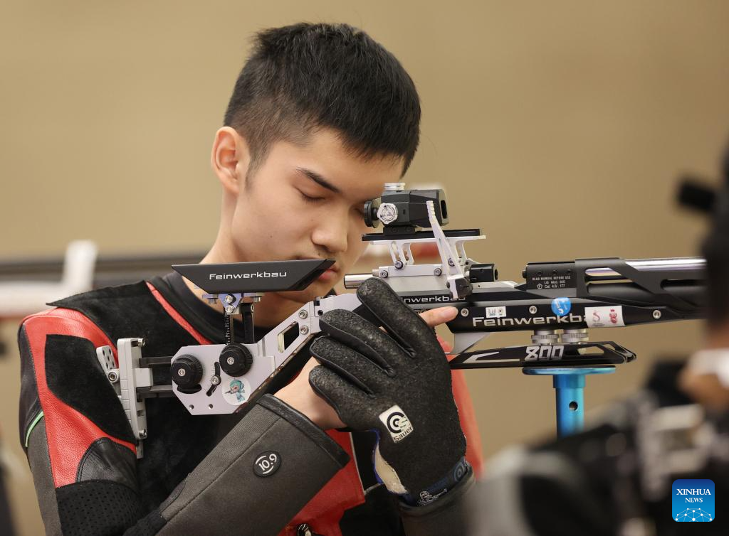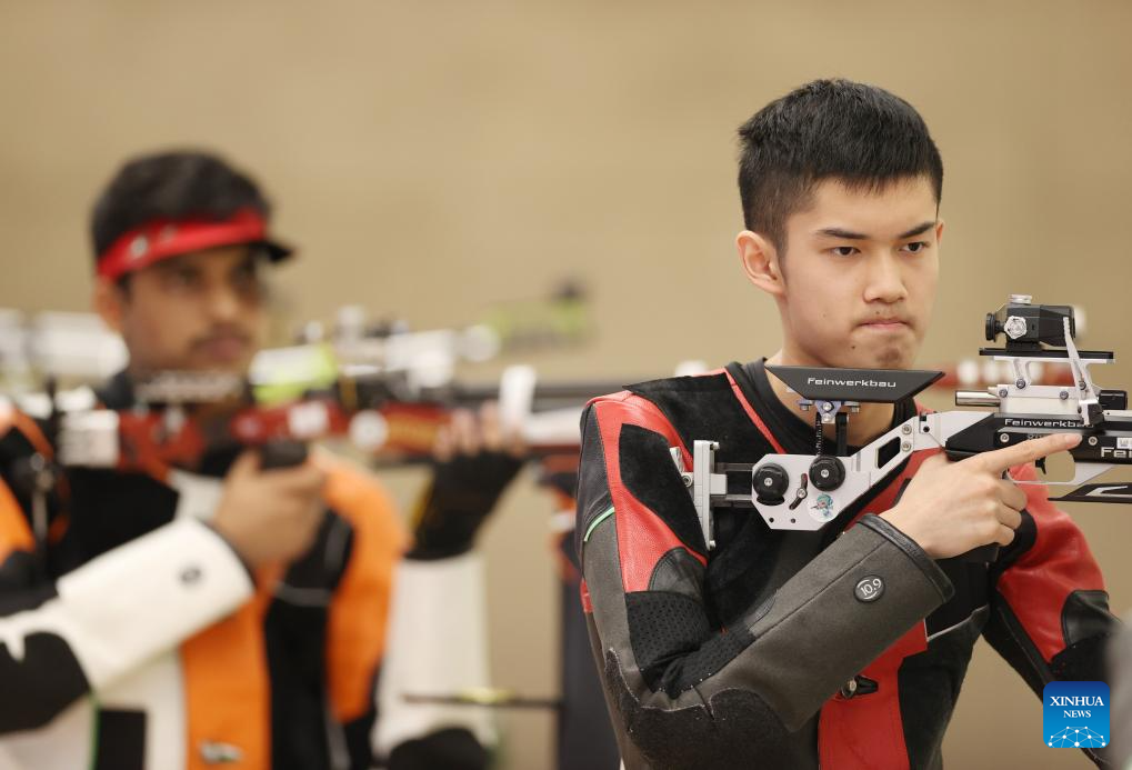 Sheng Lihao of China competes during the Men's 10m Air Rifle Final of Shooting at the 19th Asian Games in Hangzhou, east China's Zhejiang Province, Sept. 25, 2023. (Xinhua/Jia Haocheng)