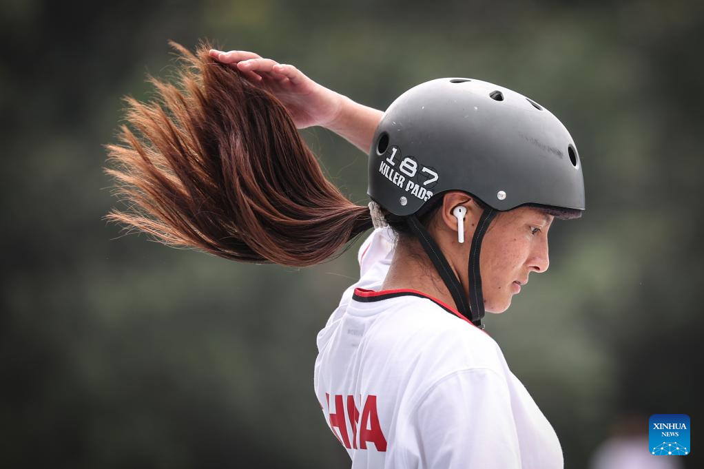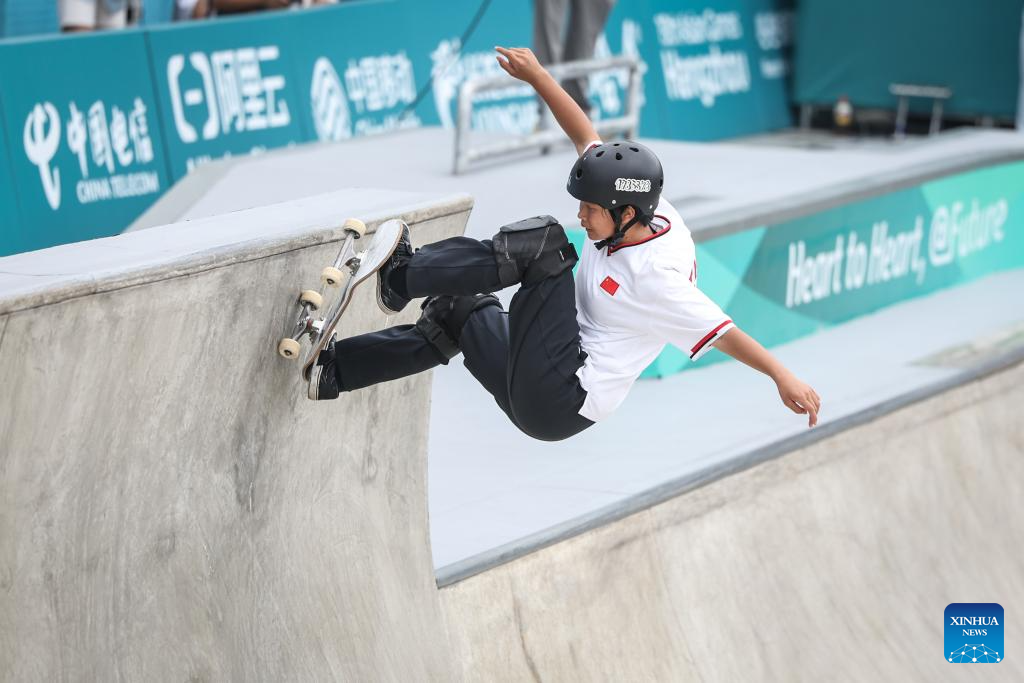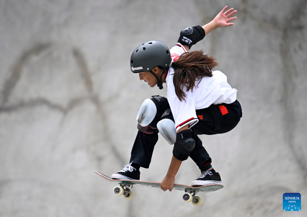 Mao Jiasi of China competes during the Women's Park Final of Skateboarding at the 19th Asian Games in Hangzhou, east China's Zhejiang Province, Sept. 25, 2023. (Xinhua/Song Yanhua)