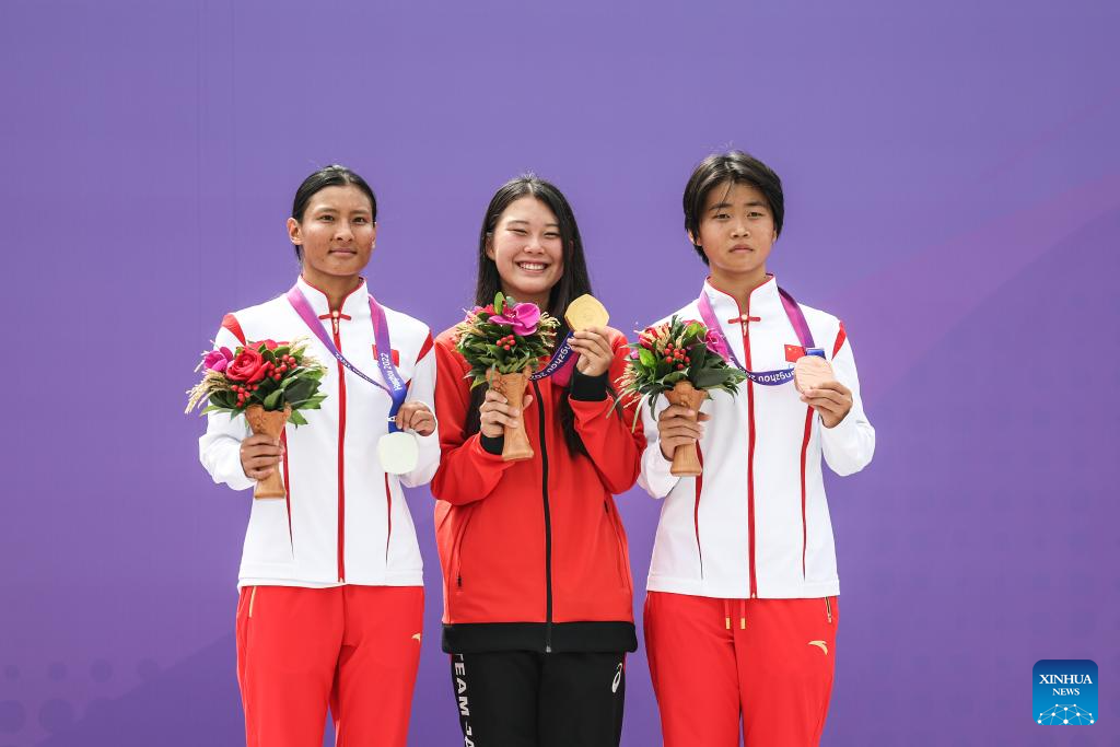 Gold medalist Kusaki Hinano (C) of Japan, silver medalist Li Yujuan (L) of China and bronze medalist Mao Jiasi of China attend the awarding ceremony for the Women's Park of Skateboarding at the 19th Asian Games in Hangzhou, east China's Zhejiang Province, Sept. 25, 2023. (Xinhua/Pan Yulong)