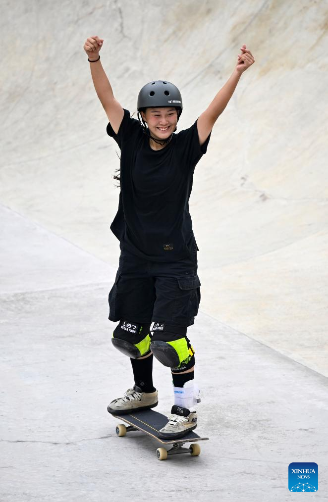Kusaki Hinano of Japan celebrates during the Women's Park Final of Skateboarding at the 19th Asian Games in Hangzhou, east China's Zhejiang Province, Sept. 25, 2023. (Xinhua/Song Yanhua)