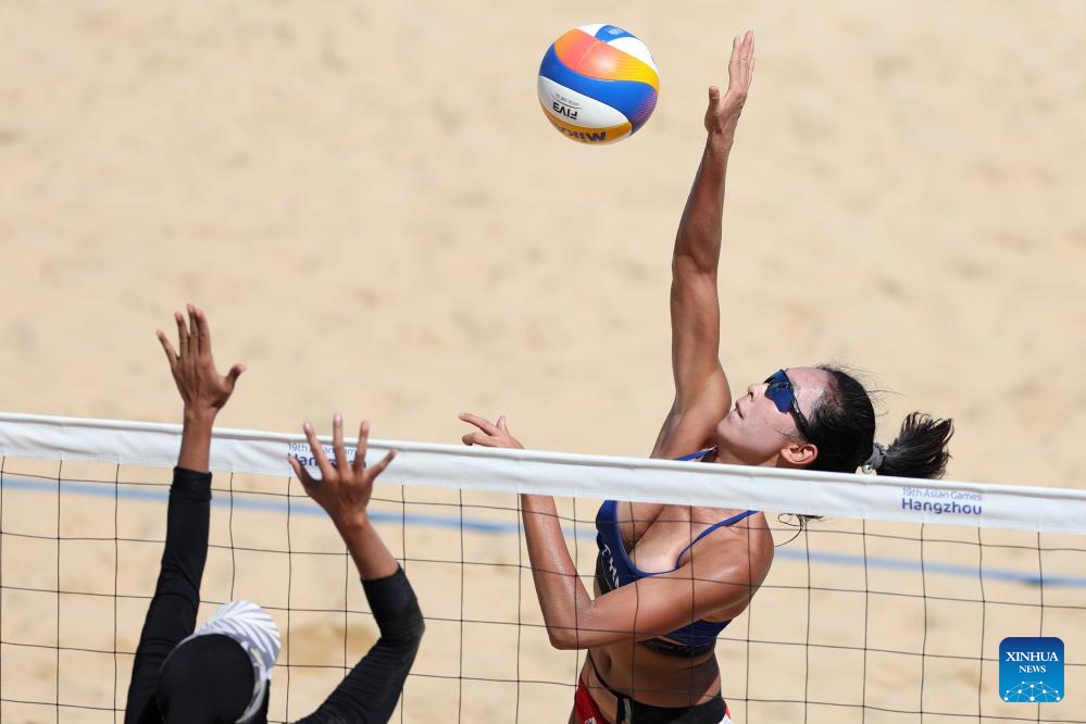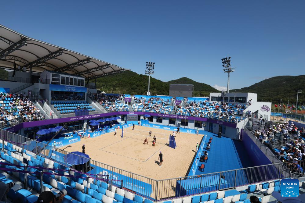 This photo taken on Sept. 25, 2023 shows the Beach Volleyball Women's Quarterfinal match between Wang Fan/Dong Jie of China and Dhita Juliana/Desi Ratnasari of Indonesia at the 19th Asian Games in Ningbo, east China's Zhejiang Province. (Xinhua/Chen Bin)