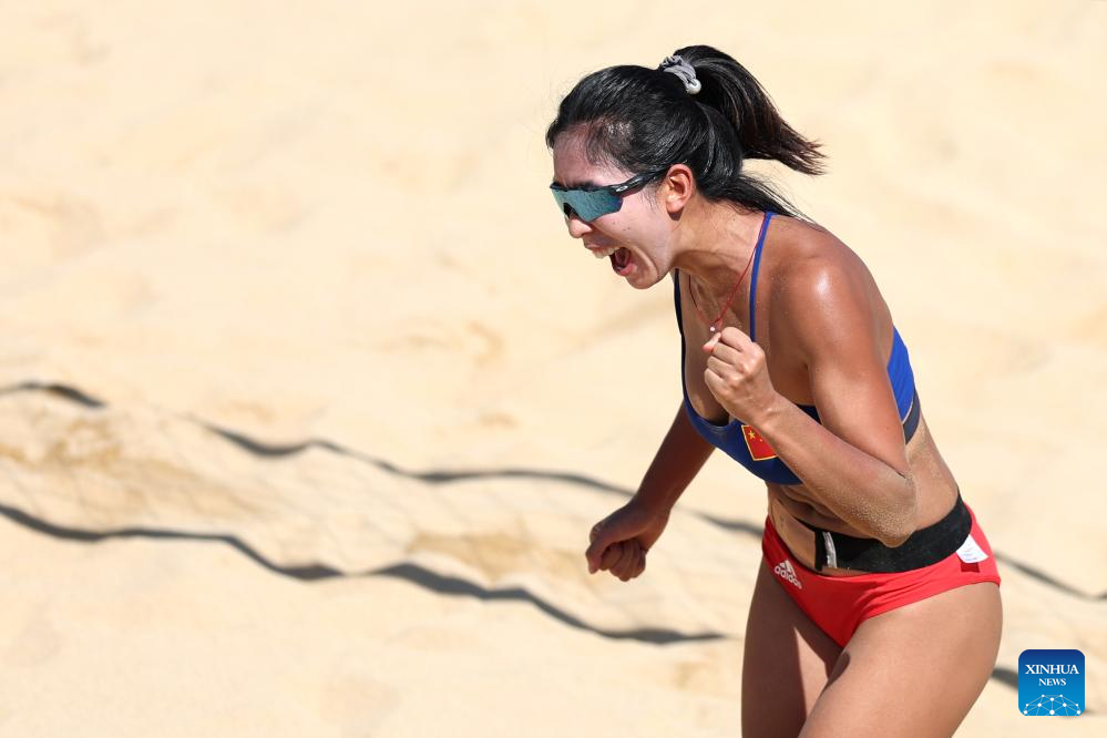 Dong Jie of China celebrates scoring during the Beach Volleyball Women's Quarterfinal match between Wang Fan/Dong Jie of China and Dhita Juliana/Desi Ratnasari of Indonesia at the 19th Asian Games in Ningbo, east China's Zhejiang Province, Sept. 25, 2023. (Xinhua/Chen Bin)