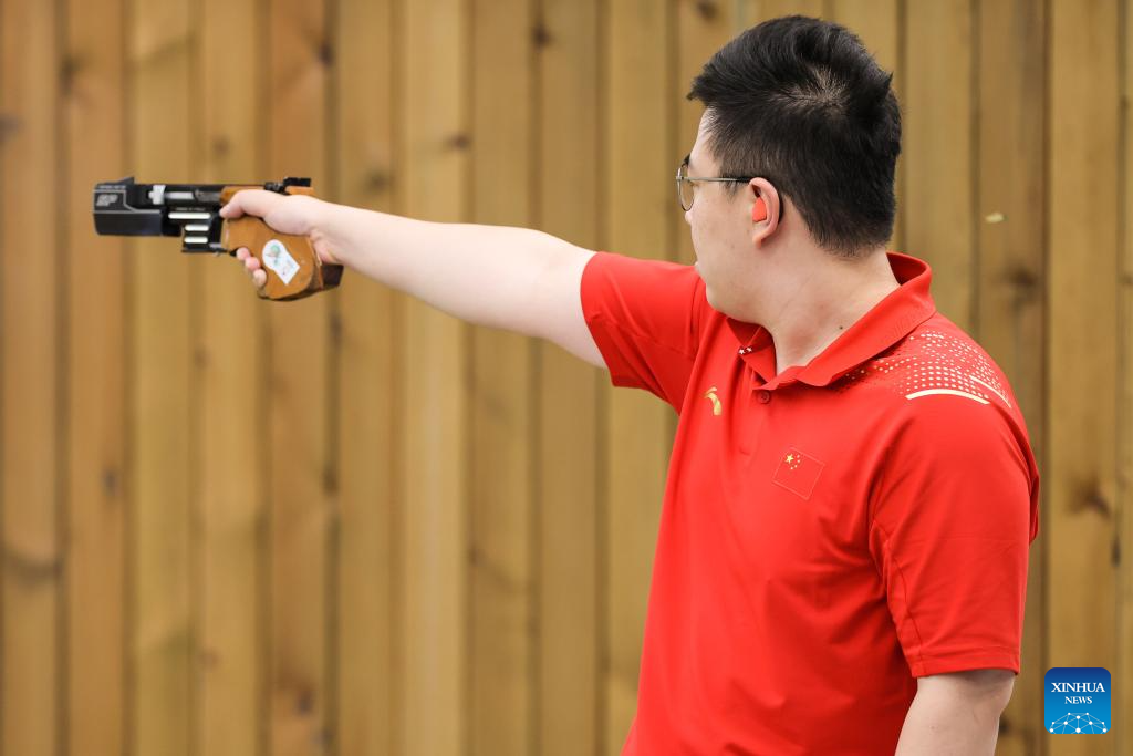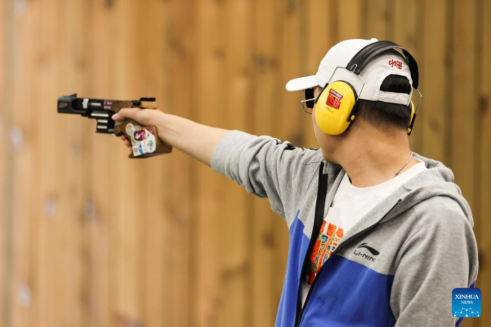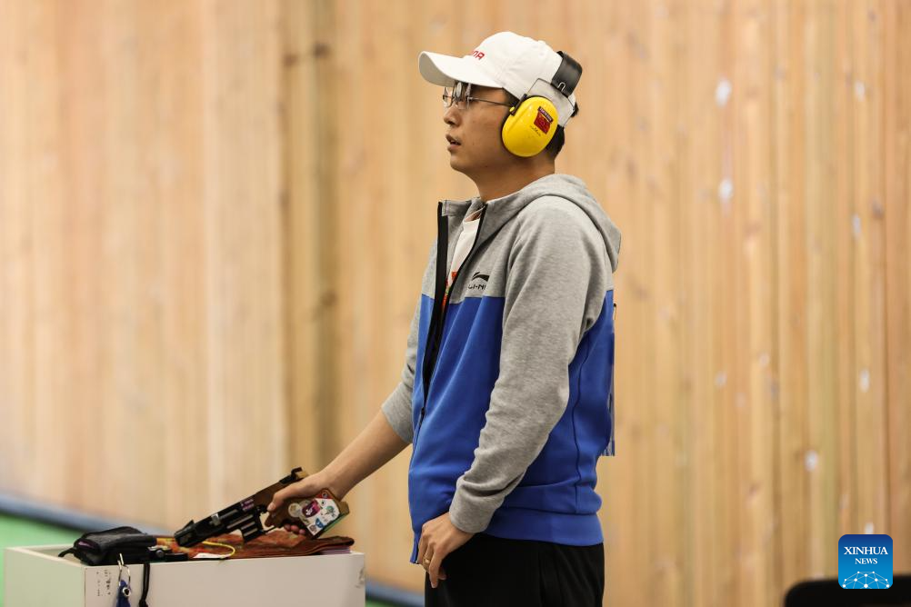 Liu Yangpan of China prepares to compete during the Men's Team 25m Rapid Fire Pistol of Shooting at the 19th Asian Games in Hangzhou, east China's Zhejiang Province, Sept. 25, 2023. (Xinhua/Shan Yuqi)