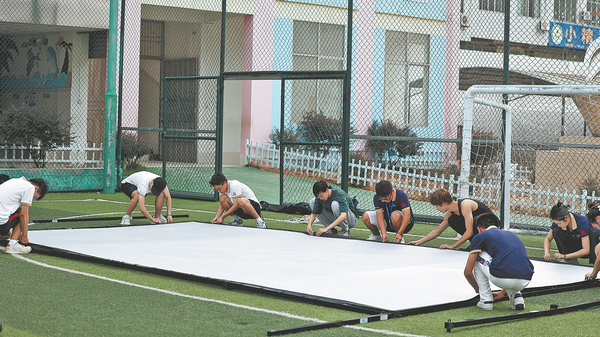 Rural art education volunteers erect a giant movie screen at a school in Dahua Yao autonomous county in the Guangxi Zhuang autonomous region. CHINA DAILY