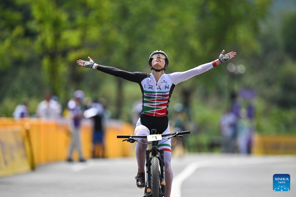 Faranak Partoazar of Iran celebrates after the Women's Cross Country Olympic of Cycling Mountain Bike at the 19th Asian Games in Chun'an County of Hangzhou, east China's Zhejiang Province, Sept. 25, 2023. (Xinhua/Hu Huhu)