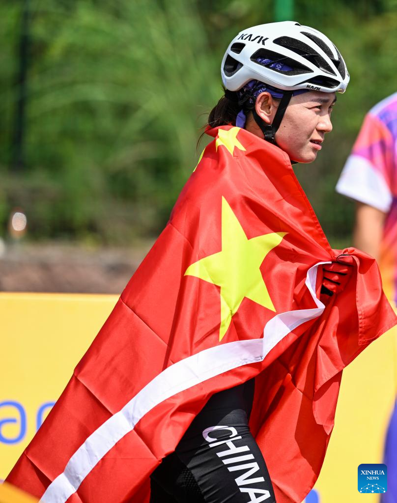 Li Hongfeng of China celebrates after the Women's Cross Country Olympic of Cycling Mountain Bike at the 19th Asian Games in Chun'an County of Hangzhou, east China's Zhejiang Province, Sept. 25, 2023. (Xinhua/Hu Huhu)