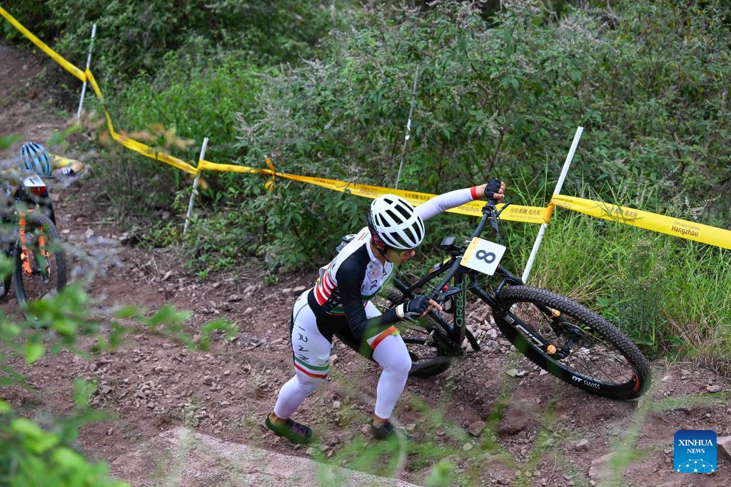 Faranak Partoazar of Iran competes during the Women's Cross Country Olympic of Cycling Mountain Bike at the 19th Asian Games in Chun'an County of Hangzhou, east China's Zhejiang Province, Sept. 25, 2023. (Xinhua/Hu Huhu)