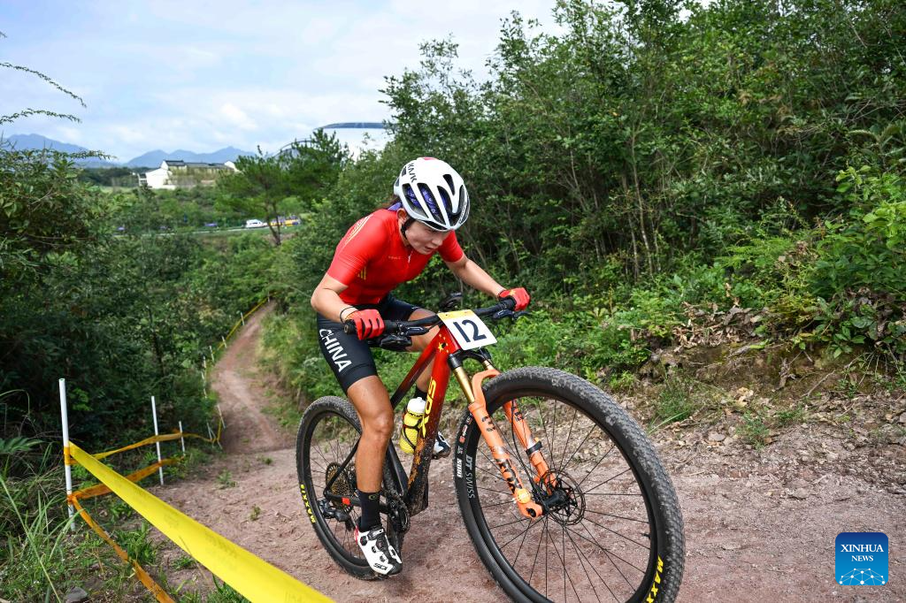 Li Hongfeng of China competes during the Women's Cross Country Olympic of Cycling Mountain Bike at the 19th Asian Games in Chun'an County of Hangzhou, east China's Zhejiang Province, Sept. 25, 2023. (Xinhua/Hu Huhu)
