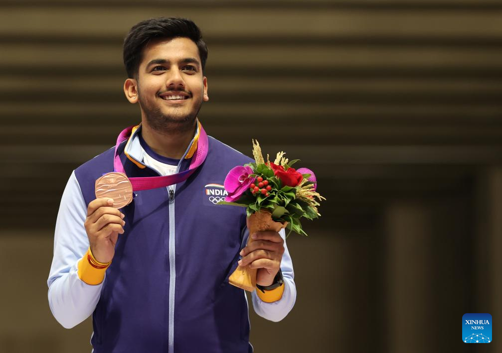 Bronze medalist Aishwary Pratap Singh Tomar of India attends the awarding ceremony for the Men's 10m Air Rifle of Shooting at the 19th Asian Games in Hangzhou, east China's Zhejiang Province, Sept. 25, 2023. (Xinhua/Jia Haocheng)