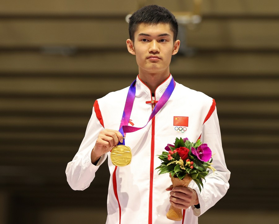 Gold medalist Sheng Lihao of China attends the awarding ceremony for the men's 10m air rifle at the Hangzhou Asian Games on Sept. 25, 2023. (Xinhua/Jia Haocheng)