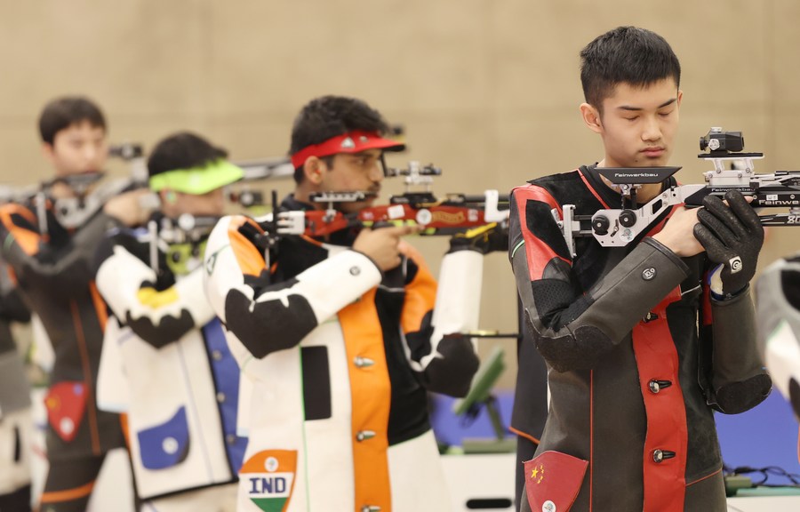 India claimed the men's 10m air rifle team title with a world record in 1,893.7 points. South Korea took silver with 1,890.1, and the team of Sheng, Du, and Yu Haonan earned bronze for China with 1,888.2.