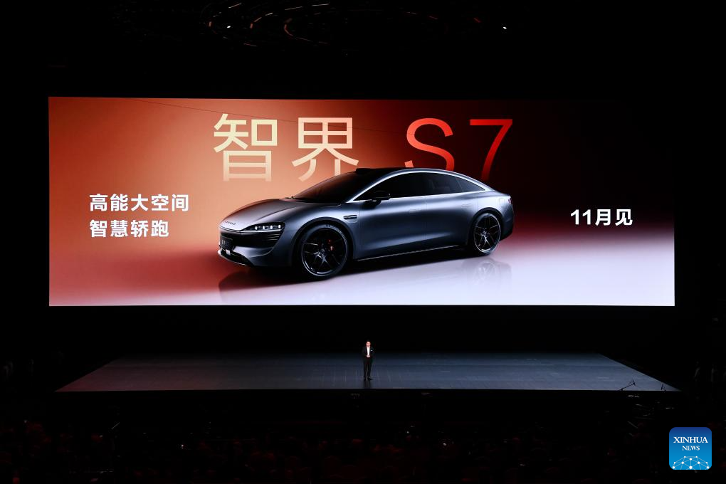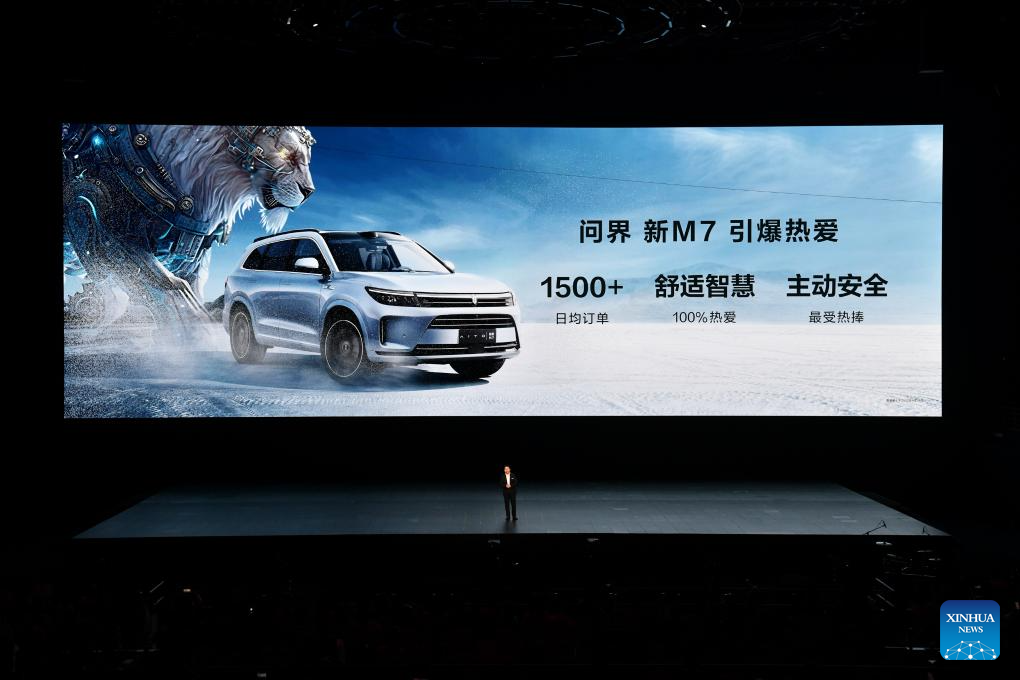 AITO M7 is displayed at a product launch event of Huawei in Shenzhen, south China's Guangdong Province, Sept. 25, 2023. Chinese telecom giant Huawei held a product launch event on Monday in Shenzhen. (Xinhua/Liang Xu)
