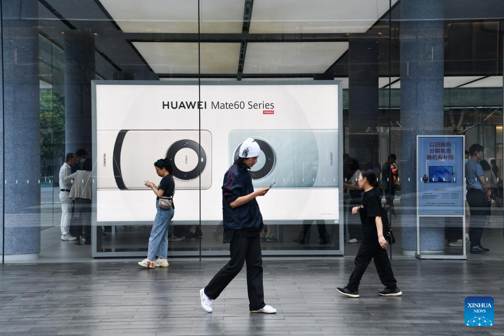 People walk past a flagship store of Huawei in Shenzhen, south China's Guangdong Province, Sept. 11, 2023. Chinese telecom giant Huawei held a product launch event on Monday in Shenzhen. (Xinhua/Liang Xu)