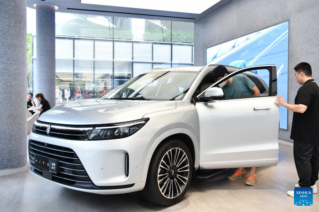 A customer experiences AITO M7 at a flagship store of Huawei in Shenzhen, south China's Guangdong Province, Sept. 11, 2023. Chinese telecom giant Huawei held a product launch event on Monday in Shenzhen. (Xinhua/Liang Xu)