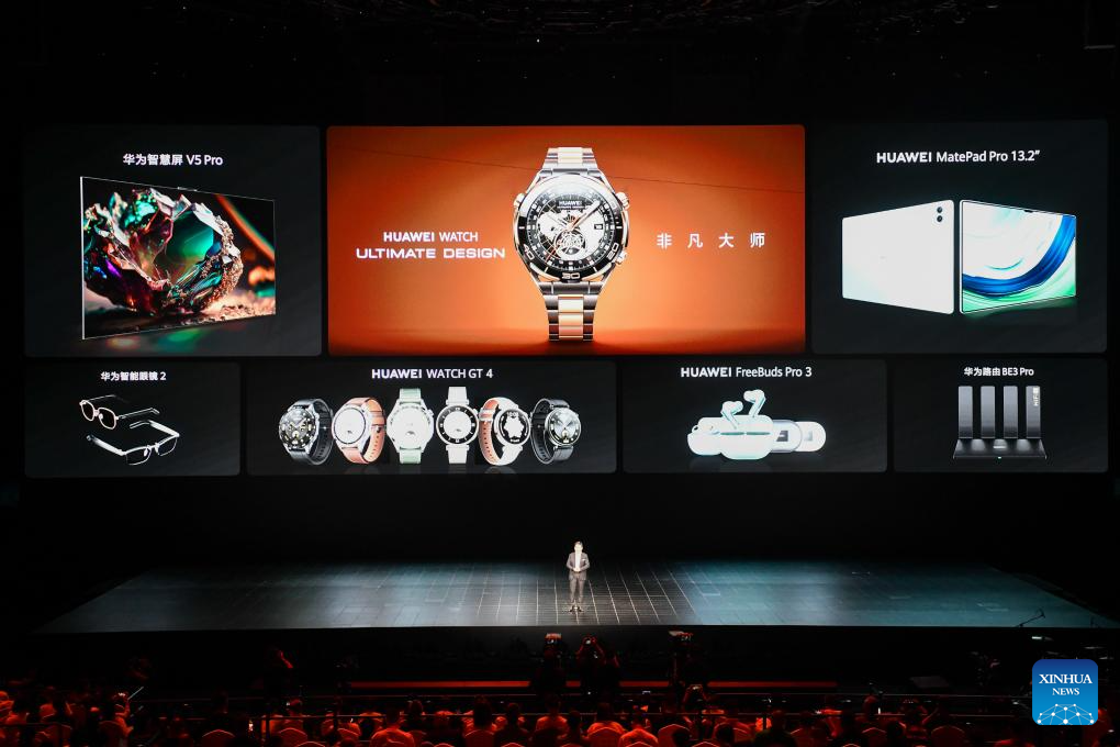 Products with the latest technologies are displayed at a product launch event of Huawei in Shenzhen, south China's Guangdong Province, Sept. 25, 2023. Chinese telecom giant Huawei held a product launch event on Monday in Shenzhen. (Xinhua/Liang Xu)