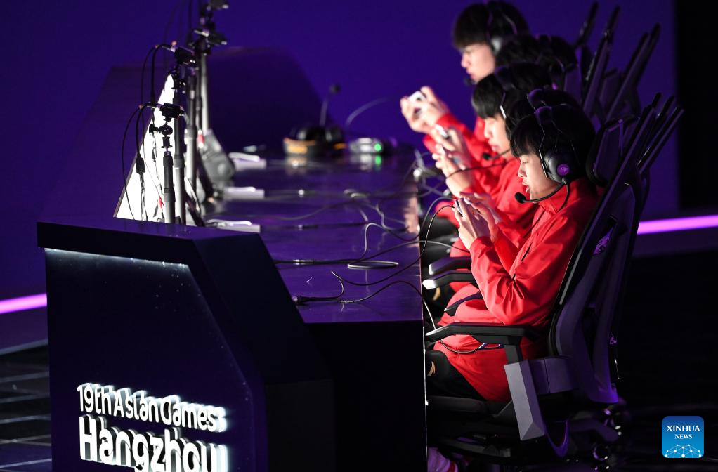 Team China compete during Arena of Valor Asian Games Version Semifinal of Esports at the 19th Asian Games in Hangzhou, east China's Zhejiang Province, Sept. 25, 2023. (Xinhua/Yan Linyun)