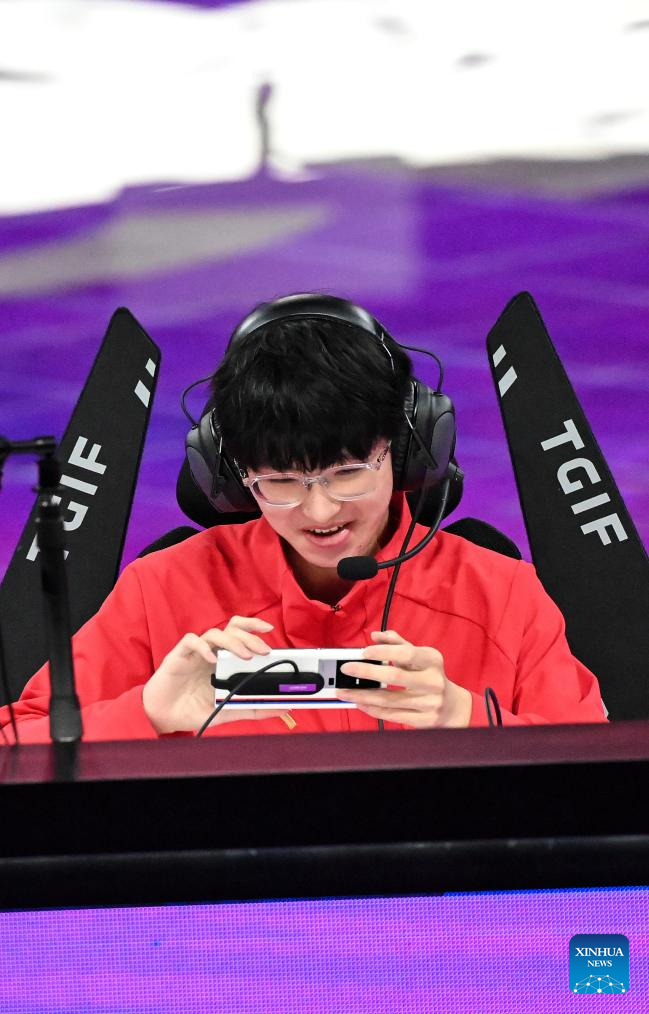 Xu Bicheng of China reacts after Arena of Valor Asian Games Version Semifinal of Esports at the 19th Asian Games in Hangzhou, east China's Zhejiang Province, Sept. 25, 2023. (Xinhua/Yan Linyun)