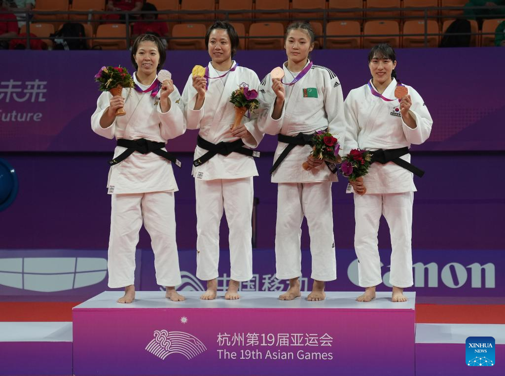 Silver medalist Mun Songhui of the Democratic People's Republic of Korea (DPRK), gold medalist Tanaka Shiho of Japan, bronze medalists Gulnoza Matniyazova of Uzbekistan and Feng Yingying of China (L-R) attend the awarding ceremony for Judo Women's 70kg at the 19th Asian Games in Hangzhou, east China's Zhejiang Province, Sept. 25, 2023. (Xinhua/Wan Xiang)