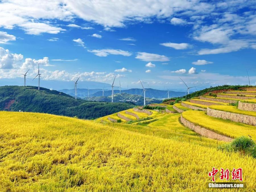 An abandoned quarry turned rice field enters harvest season with wind turbines at the background, forming a unique landscape in Hezhou, south China's Guangxi Zhuang Autonomous Region. (Photo: China News Service/Deng Jingzi)