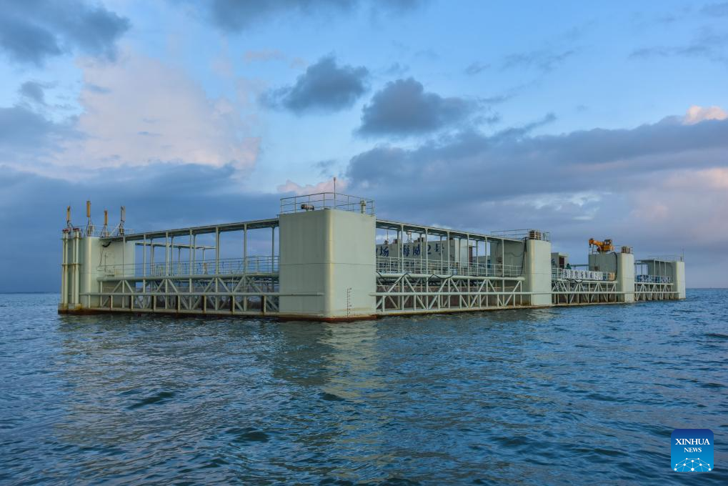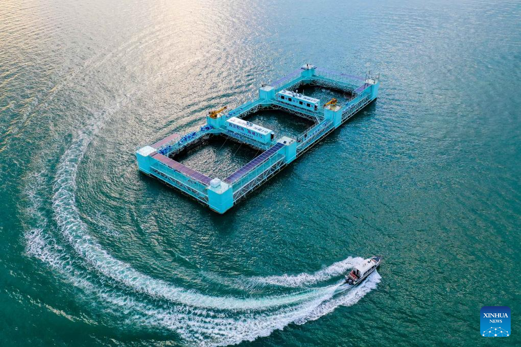 This photo taken on Sept. 20, 2023 shows the "Haiwei-2," an intelligent semi-submersible aquaculture platform in Liusha Bay of Zhanjiang, south China's Guangdong Province. (Xinhua/Liu Dawei)