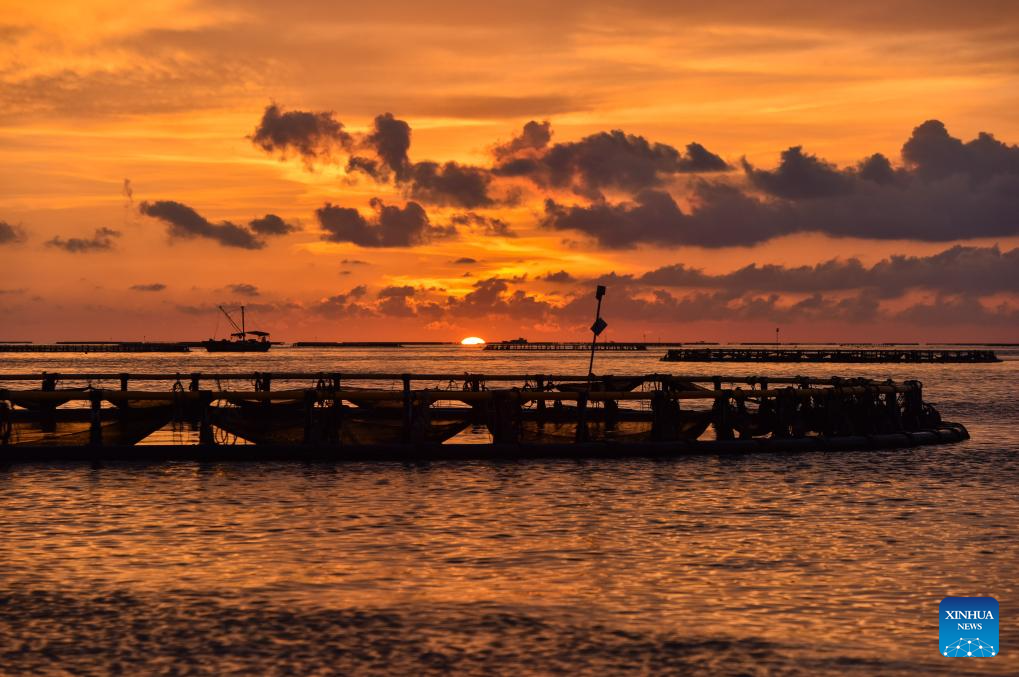 A marine ranch is pictured at sunset in Liusha Bay of Zhanjiang, south China's Guangdong Province, Sept. 20, 2023. (Xinhua/Liu Dawei)