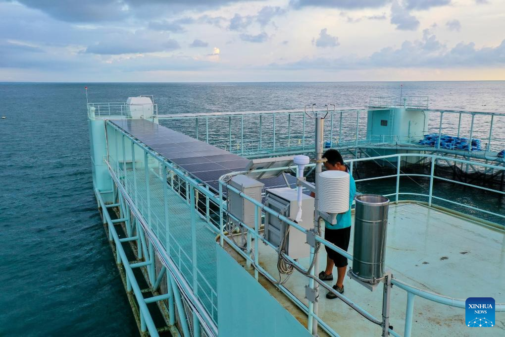 This aerial photo taken on Sept. 20, 2023 shows a staff member checking equipment on "Haiwei-2," an intelligent semi-submersible aquaculture platform in Liusha Bay of Zhanjiang, south China's Guangdong Province. (Xinhua/Liu Dawei)