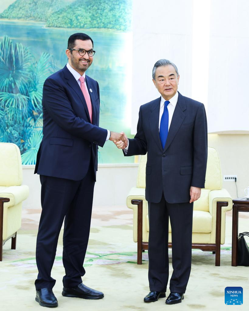 BEIJING, Sept. 26 (Xinhua) -- Wang Yi, a member of the Political Bureau of the Communist Party of China Central Committee, met with COP28 United Arab Emirates (UAE) President-Designate Sultan Al Jaber in Beijing on Tuesday.