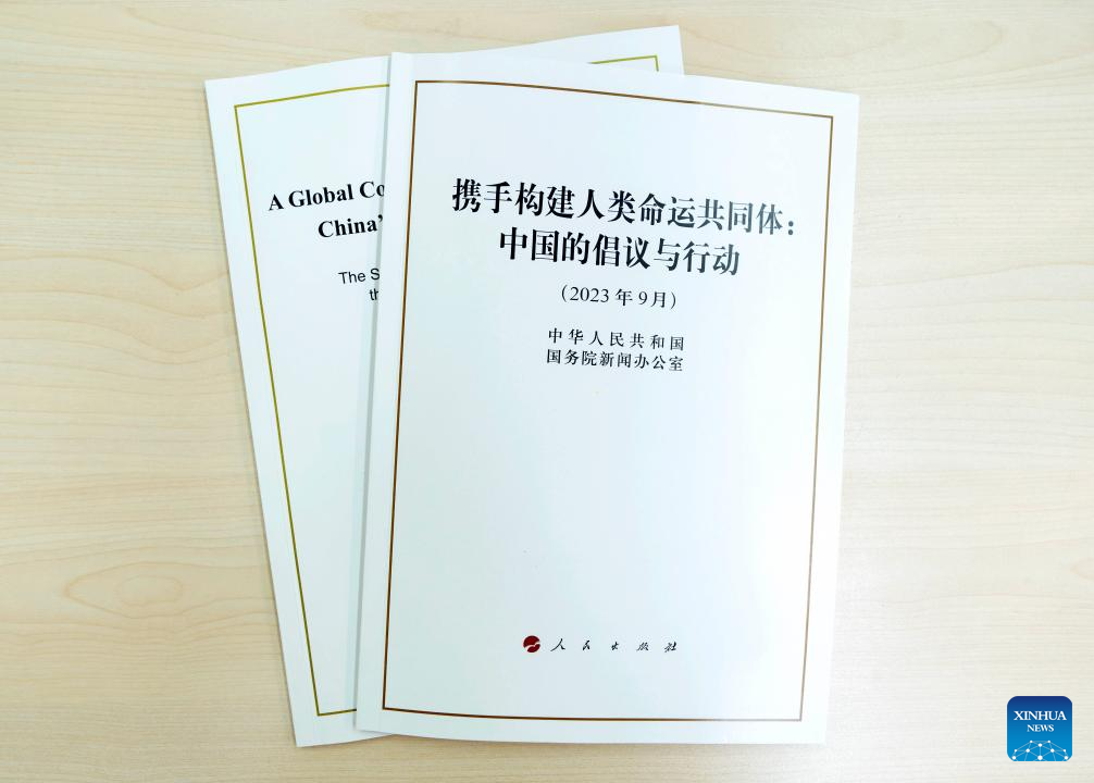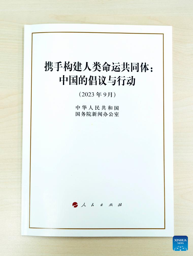 This photo taken on Sept. 26, 2023 shows the Chinese version of a white paper titled "A Global Community of Shared Future: China's Proposals and Actions". The white paper was released by the State Council Information Office on Tuesday. The white paper called for efforts to build an open, inclusive, clean and beautiful world that enjoys lasting peace, universal security, and common prosperity, turning people's longing for a better life into reality. (Xinhua/Cai Yang)