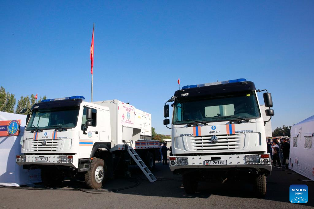 Two sets of mobile hospitals donated by China are pictured in Bishkek, Kyrgyzstan, Sept. 24, 2023. A handover ceremony of two sets of mobile hospitals from China to the Ministry of Emergency Situations of Kyrgyzstan was held here on Sunday. Kyrgyz President Sadyr Japarov and Chinese Ambassador Du Dewen attended the event. (Photo by Roman/Xinhua)