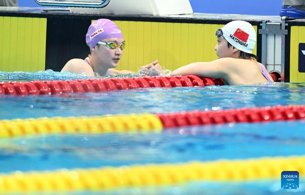 Li Bingjie (L) and Ma Yonghui of China react after the Women's 400m Freestyle Final of Swimming at the 19th Asian Games in Hangzhou, east China's Zhejiang Province, Sept. 26, 2023. (Xinhua/Xue Yuge)