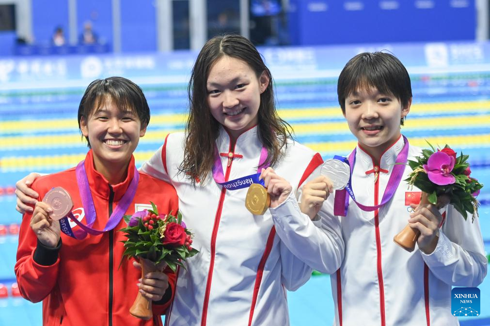 (From L-R) Silver medallist Ma Yonghui of China, gold medallist Li Bingjie of China and bronze medallist Kobori Waka of Japan attend the awarding ceremony of the women's 400m freestyle swimming at the 19th Asian Games in Hangzhou, east China's Zhejiang Province, Sept. 26, 2023. (Xinhua/Xue Yuge)