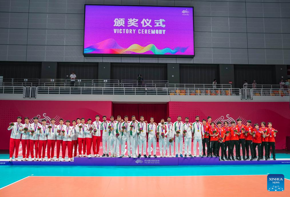 Gold Medalists of Team Iran attend the awarding ceremony for Men's Volleyball at the 19th Asian Games in Hangzhou, east China's Zhejiang Province, Sept. 26, 2023. (Xinhua/Sun Fei)