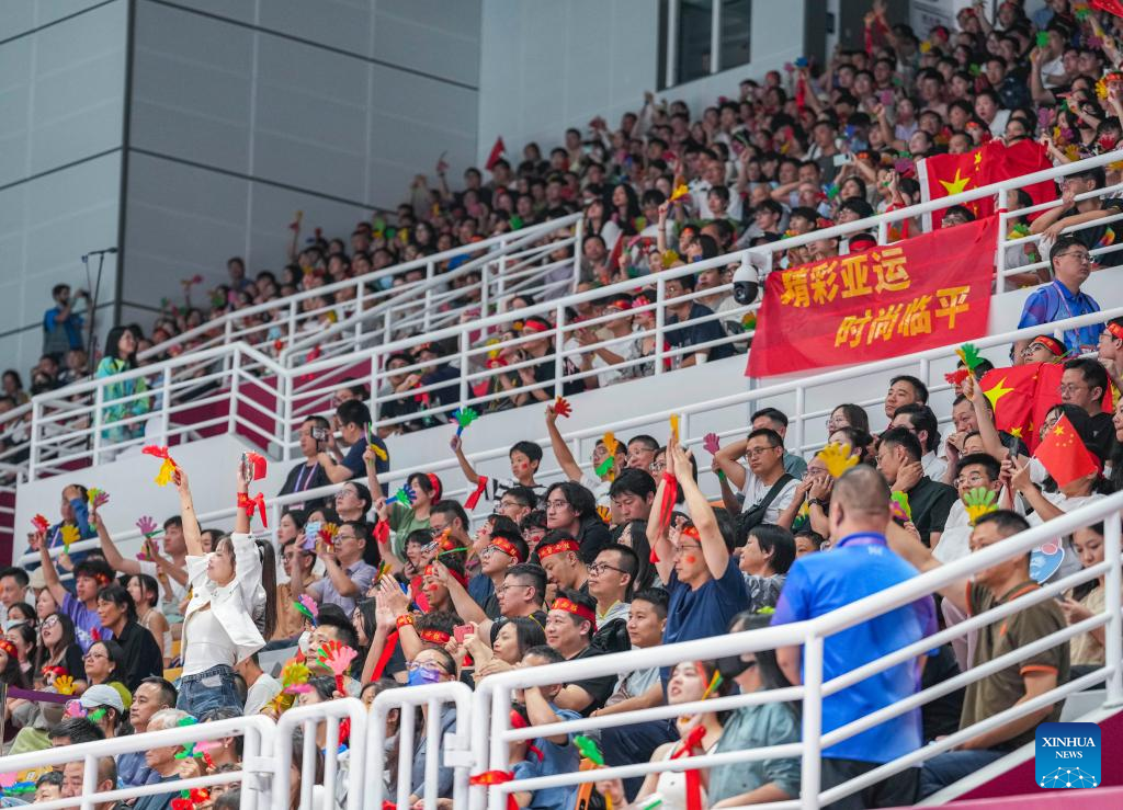 Audience cheer for players during the Volleyball Men's Gold Medal Match between China and Iran at the 19th Asian Games in Hangzhou, east China's Zhejiang Province, Sept. 26, 2023. (Xinhua/Sun Fei)