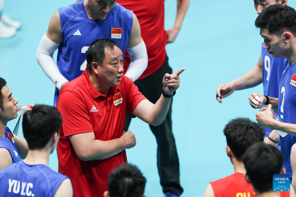 Coach Wu Sheng of Team China instructs his players during the gold medal match of volleyball between China and Iran at the 19th Asian Games in Hangzhou, east China's Zhejiang Province, Sept. 26, 2023. (Xinhua/Zhu Zheng)