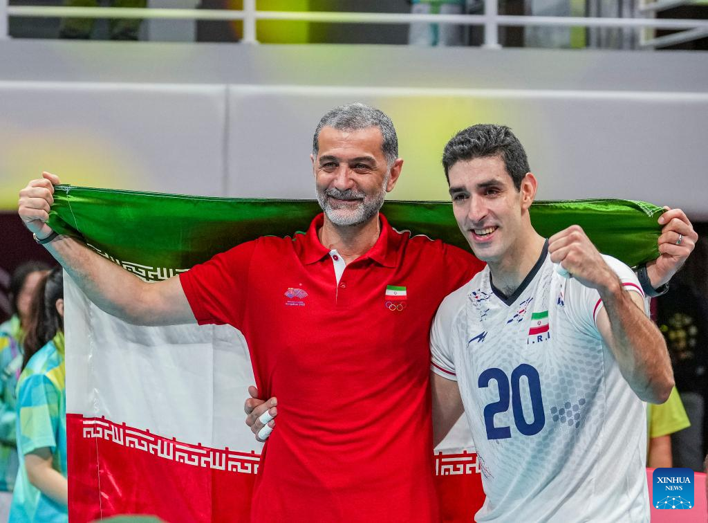 Shahrooz Homyoun Farmanesh (R) of Iran celebrates with Head Coach Behrouz Ataeinouri after the Volleyball Men's Gold Medal Match between China and Iran at the 19th Asian Games in Hangzhou, east China's Zhejiang Province, Sept. 26, 2023. (Xinhua/Sun Fei)