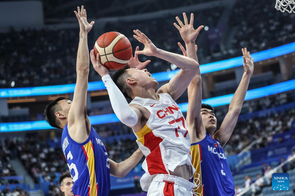 Zhang Zhenlin (C) of China competes during the Men's Preliminary Round match of Basketball between China and Mongolia at the 19th Asian Games in Hangzhou, east China's Zhejiang Province, Sept. 26, 2023. (Xinhua/Pan Yulong)