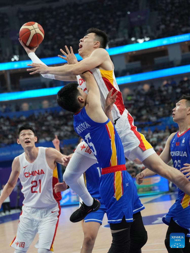 Wang Zhelin (top) of China competes during the Men's Preliminary Round match of Basketball between China and Mongolia at the 19th Asian Games in Hangzhou, east China's Zhejiang Province, Sept. 26, 2023. (Xinhua/Meng Yongmin)
