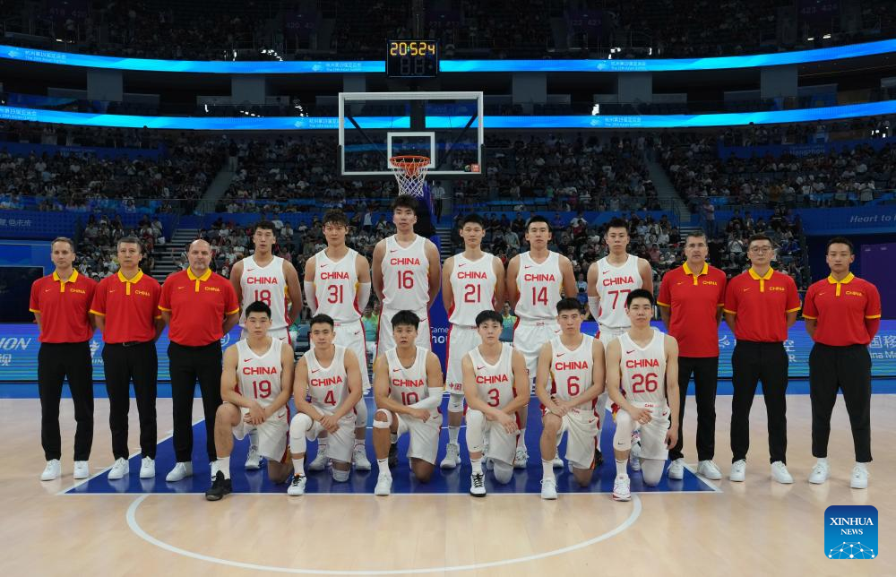 Players pose for photo before the Men's Preliminary Round match of Basketball between China and Mongolia at the 19th Asian Games in Hangzhou, east China's Zhejiang Province, Sept. 26, 2023. (Xinhua/Meng Yongmin)