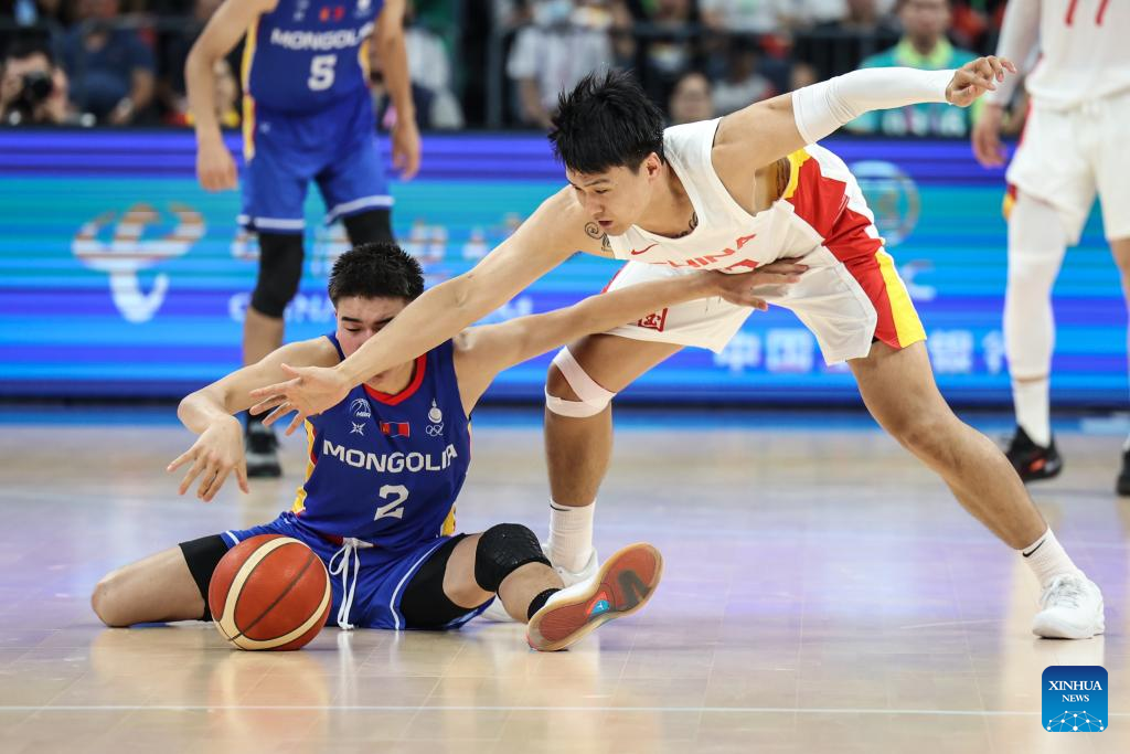Cheng Shuaipeng (1st, L) of China competes during the Men's Preliminary Round match of Basketball between China and Mongolia at the 19th Asian Games in Hangzhou, east China's Zhejiang Province, Sept. 26, 2023. (Xinhua/Pan Yulong)