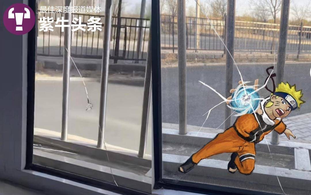 A picture created by Tang Zixi, a 26-year-old Chinese artist, shows Naruto Uzumaki, the main character from the Japanese manga series “Naruto,” throwing Rasengan at a window. The creation ingeniously turned a broken spot in the window into art. (Photo courtesy of Tang Zixi)
