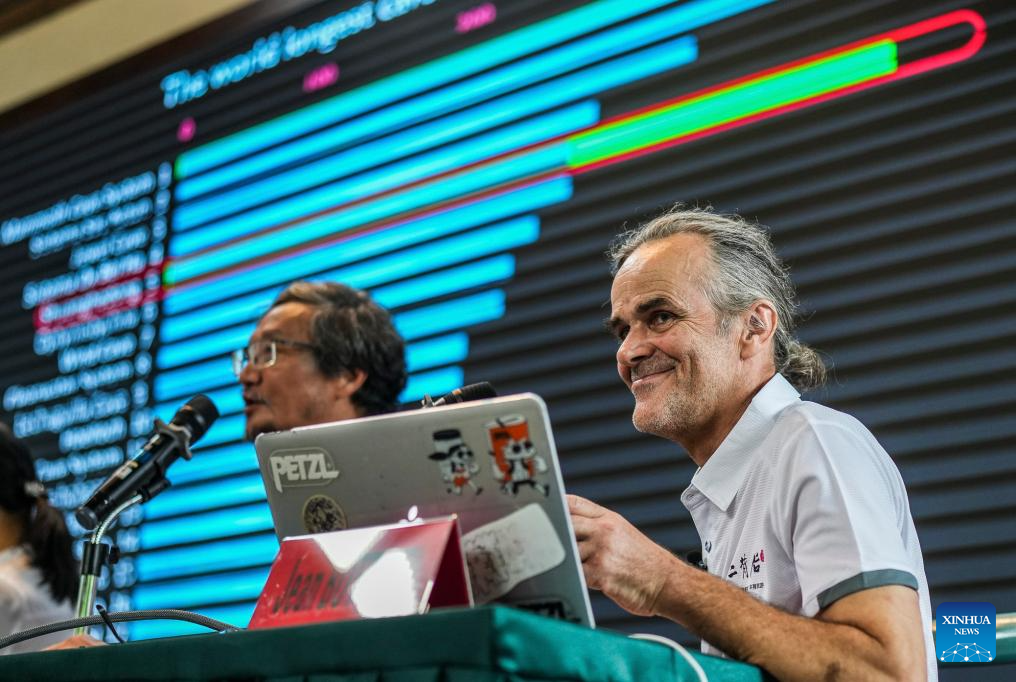 French caver Jean Bottazzi attends a press conference on the latest research results on Shuanghe Cave in Suiyang County, southwest China's Guizhou Province, Sept. 26, 2023. (Xinhua/Tao Liang)