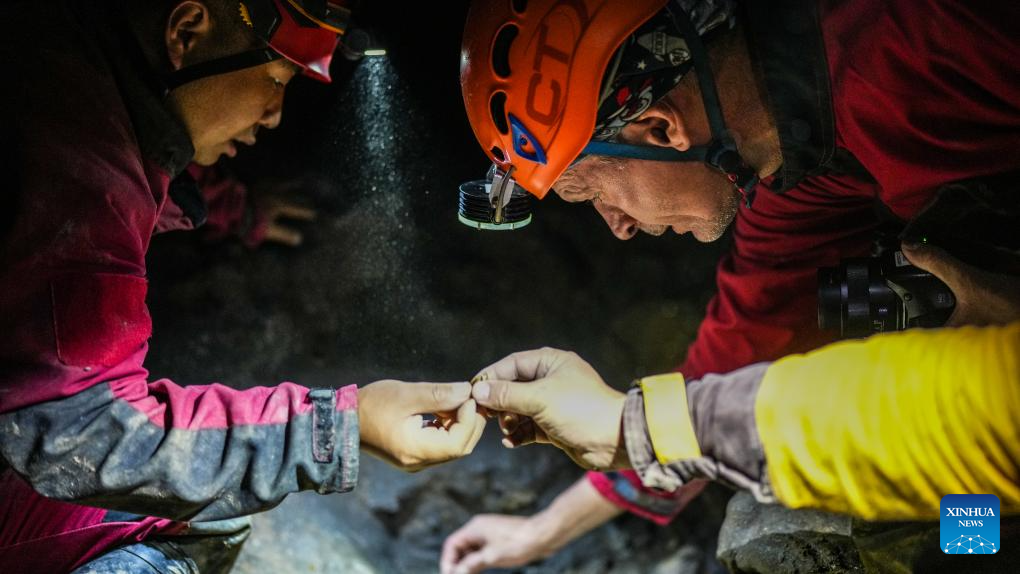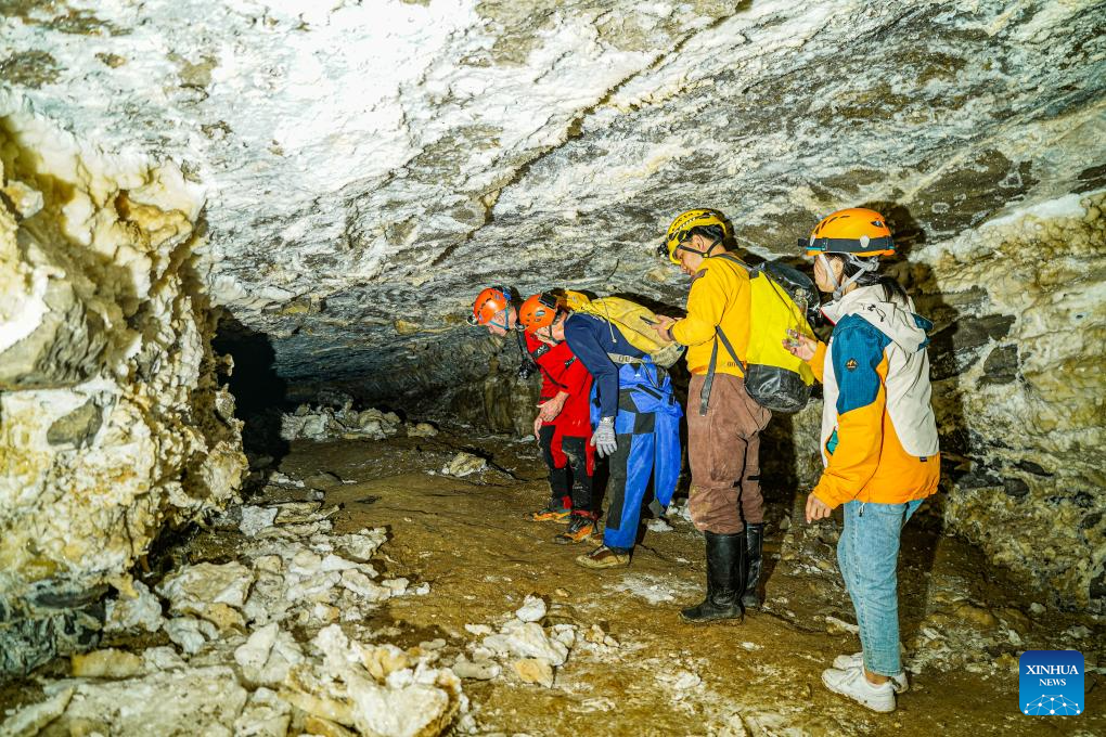 An Italian expert and members of Guizhou provincial mountain resources institute explore a branch cave of Shuanghe Cave in Suiyang County, southwest China's Guizhou Province, Sept. 24, 2023. (Xinhua/Tao Liang)