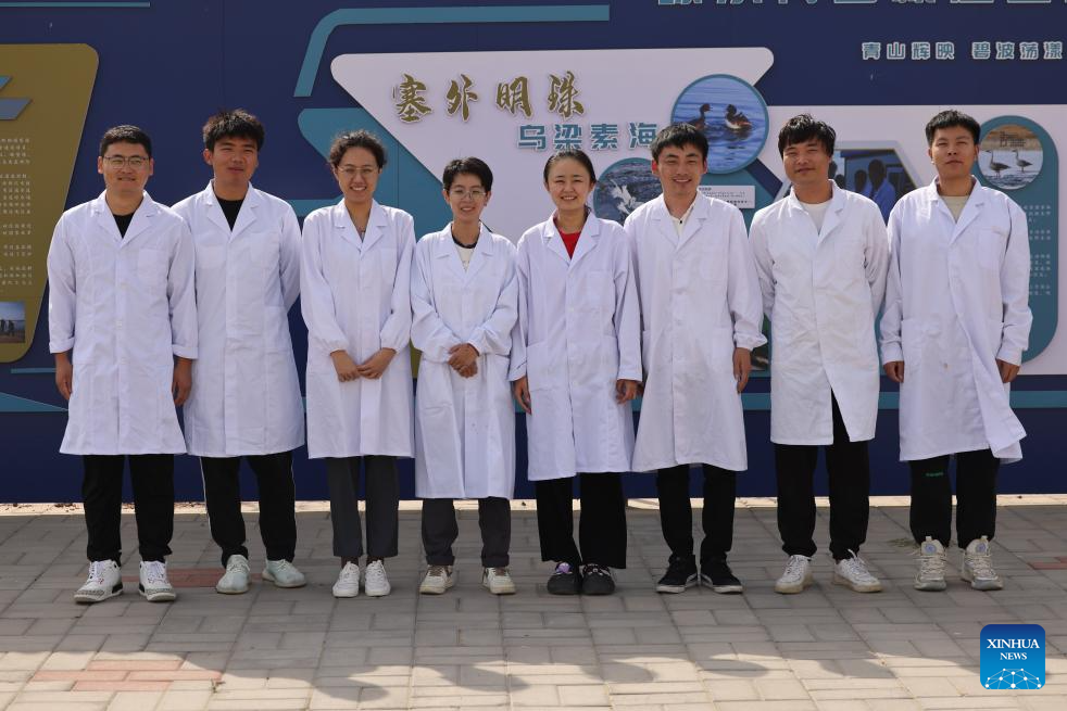 Postgraduate students pose for a group photo at an observation station of the Ulan Suhai Lake in Bayannur, north China's Inner Mongolia Autonomous Region, Sept. 14, 2023. (Xinhua/Xing Guangli)