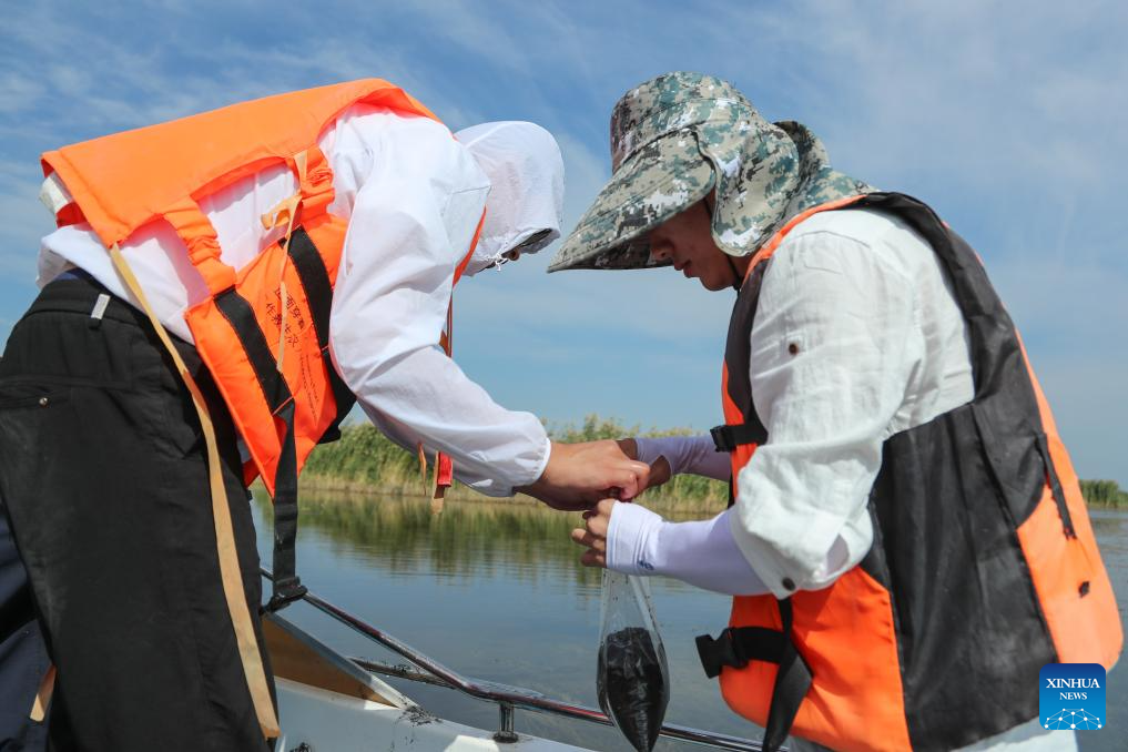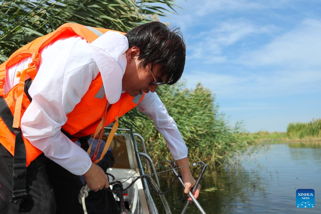 Wu Rong checks the water quality of the Ulan Suhai Lake in Bayannur, north China's Inner Mongolia Autonomous Region, Sept. 15, 2023. (Xinhua/Lian Zhen)