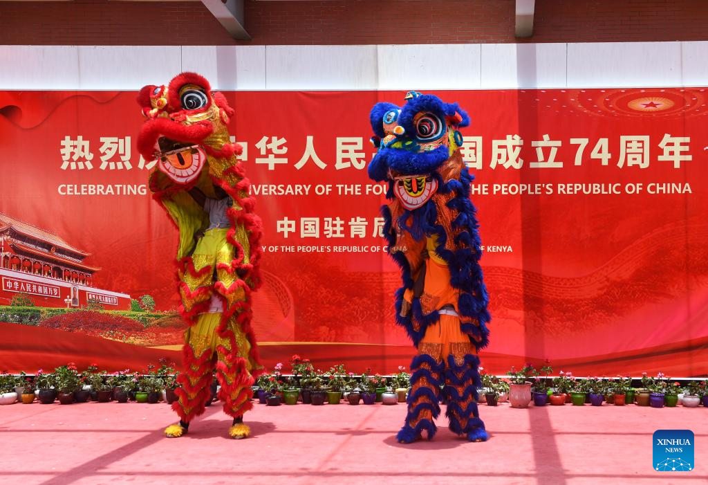 People perform a lion dance at a reception to mark the upcoming 74th anniversary of the founding of the People's Republic of China in Nairobi, Kenya, on Sept. 27, 2023. The Chinese Embassy in Kenya hosted the reception on Wednesday to mark the upcoming 74th anniversary of the founding of the People's Republic of China (PRC). (Xinhua/Li Yahui)