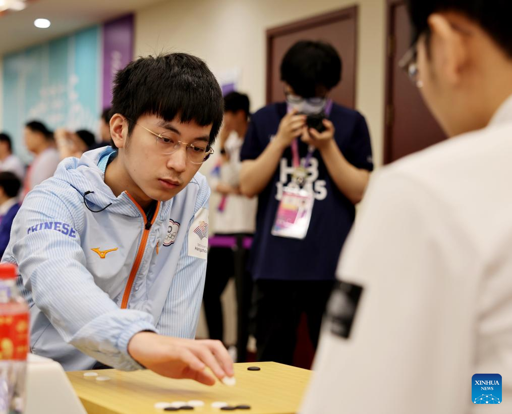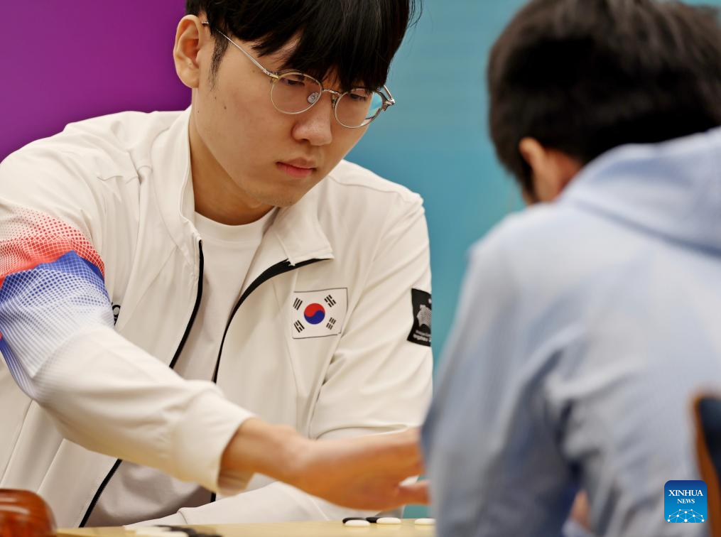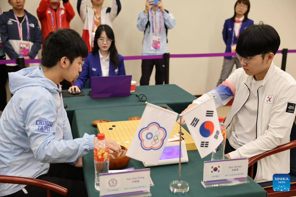 Hsu Haohung (L) of Chinese Taipei competes against Shin Jinseo of South Korea during the Men's Individual Semifinal of Go Chess at the 19th Asian Games in Hangzhou, east China's Zhejiang Province, Sept. 28, 2023. (Xinhua/Gong Bing)
